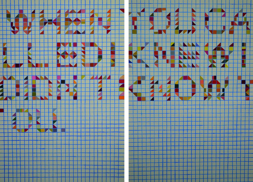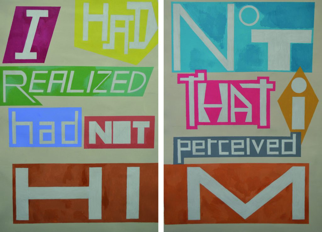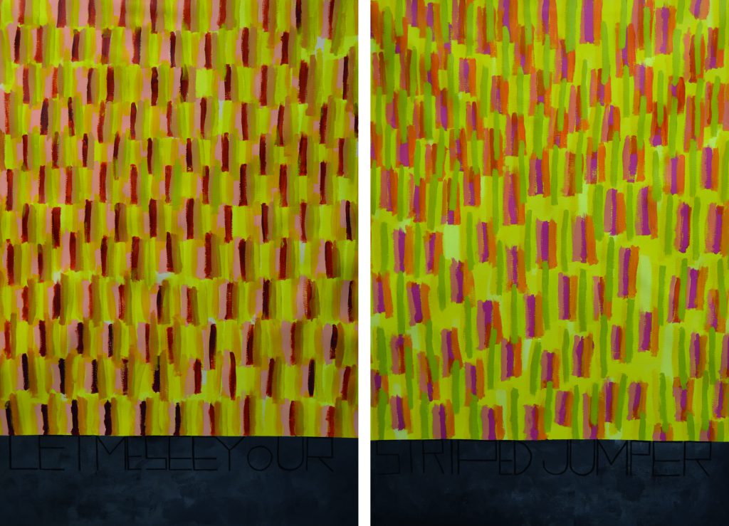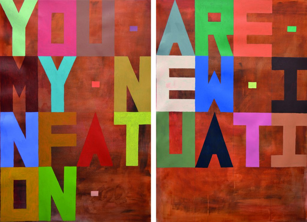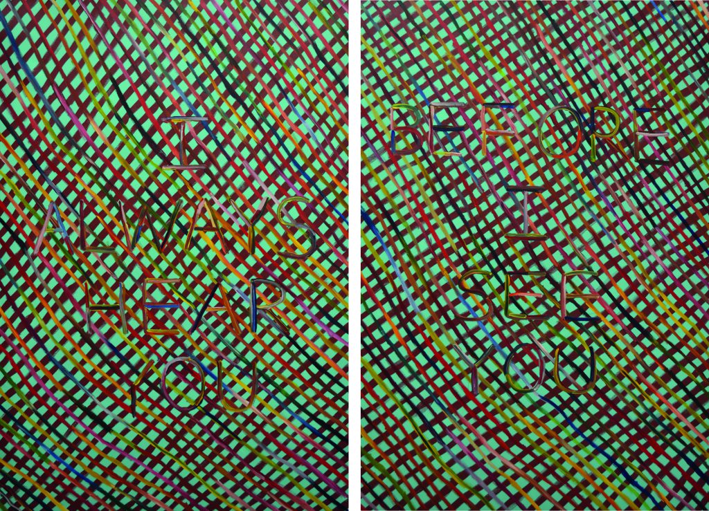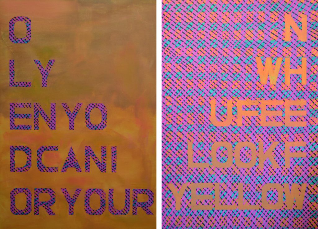 This final affirmation is not always present. My peripatetic biography reminds me of the many instances when: the bird didn’t pause, I didn’t look, it didn’t call; and ultimately I didn’t perceive. I am left longing. In these paintings, birds function as a signifier for multiple forms of melancholia. The conventional birdwatcher only documents the instances when a bird is certainly perceived. In my list of birds (in this group of paintings) I document the birds that I missed. The prose is written as if for a missing lover, a last adventure, a lost land. Typography, abstraction and their many potentialities in between, find a space to think through the way we project language. These unidentified birds offer a way of documenting a form of greyzone, and co-inhabited landscapes. I Always Hear You Before I See You constructs an archive of ‘what-ifs’, ‘maybes’ and ‘hopefullys’. Painting is a vessel for projection systems to operate; in these works text enters that conduit and becomes another form of projection.