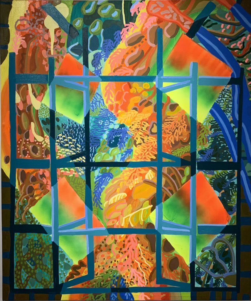 Dense biomes are contained within architectural elements: window frames, tiles, stone floors, stairs and balustrades enclose vibrant landscapes filled with small line works and solid structures that situate us within the artist’s perspective. This imaginary scenery resembles hieroglyphs that as a language invoke the natural world, while the multitude of layers mixes rivers with seaweed, waterfalls with calamari, mountains with human hearts. Grids, patterns and flat surfaces convey a labyrinthine spatiality of color. Warm greens, blues and pinks overflow us while cool colors recede into the background and are transfigured into geographic features.