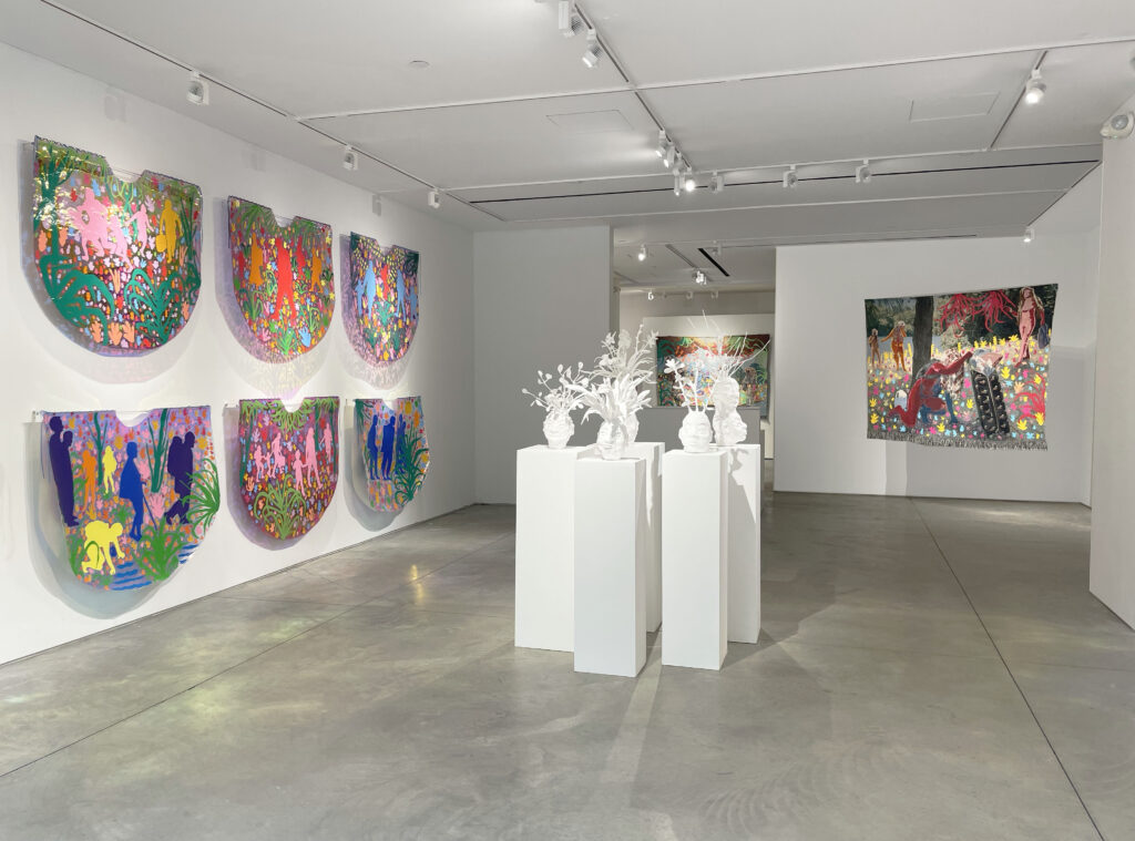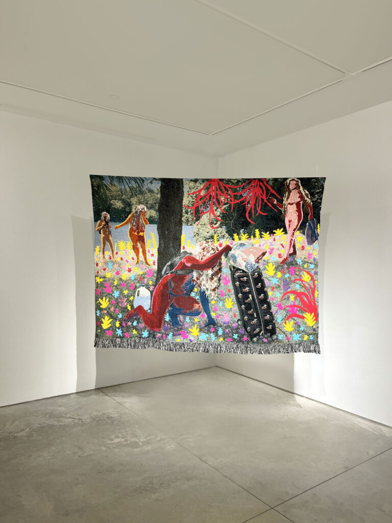 In Climate Ponchos, Corona portrays silhouettes of traveling immigrants contrasting with vibrant floral backdrops, carrying their belongings across diverse landscapes in search of a brighter future. Based on the archetype of the Traveler, the artist depicts the waves of displacement occurring as a consequence of the damage caused to our environment, while at the same time, celebrating the resplendence and vibrancy of flora and the boundless power of Nature. By weaving together the narratives of these enigmatic figures, whose identities are shrouded in mystery, Corona prompts us to reflect on the urgent need for empathy and collective action.