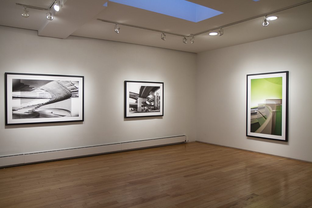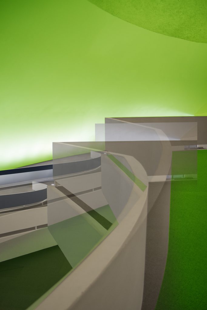 It’s not that Miño eschews the presence of things themselves; the staircases, ramps, freeway interchanges are right there. But his photographs duplicate and fold the image, solarize and color it in an unlikely palette. They alter the scale and add a tenuous gloss to the cotton paper until the real space is veiled, time brought to a standstill, and an abstract form wrenched from pure indexes. In the age of post-production and appropriationism, Miño preserves every trace of the aura of the place and the photographer: the original image is always one and it is his, guarantee of a certain fidelity to the snippet of the city he has seen and the instant he has recorded.