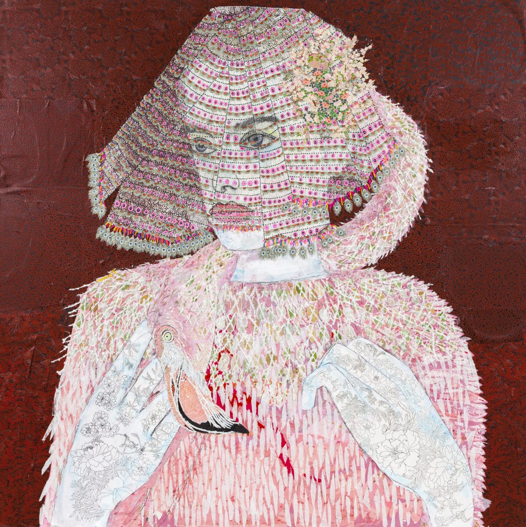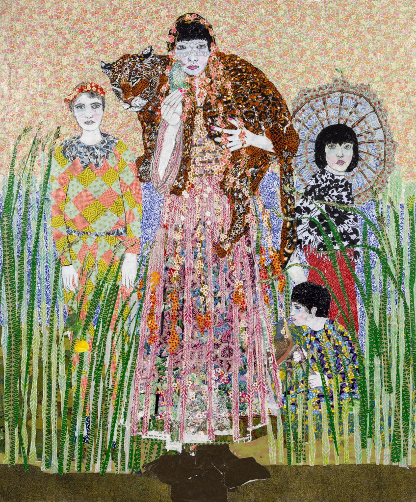 Berrio’s reference to wild life is inspired by South American folklore and recreated through her autobiographical accounts and memories. Born Again, 2015 is a powerful allusion to Madremonte or Marimonda—Mother Nature in Colombian mythology—a protector of forests and animals, but implacable to humans who attempt to destroy its domains. In the painting, a beautiful woman carries a live jaguar on her shoulders, representing the strength of womanhood. Jaguar woman wears a veil of flowers—seen also among Yanomami women’s flowery headdresses—which here blend with her garment. Her face is adorned with a fringe of beads hanging over her cheeks, maybe a reference to facial scarification or jewelry used by women from various societies and periods to enhance their beauty or to protect against evil spirits. The pattern of the live jaguar’s fur is integrated into her body as a vest, honoring the woman’s animal ancestors. The jaguar sitting on the woman’s shoulders reminds us of the legend of Heracles or Hercules, who carries a lion’s fur on his back, seen in ancient Greek and Roman sculpture and black figure painting. Strength is symbolized by the jaguar, protector of the underworld, and prevails in the physiological and spiritual metamorphoses that take place during motherhood, shared by animals and humans alike. Its resilience in the spiritual body contrasts the fragility of life itself, depicted by the image of a small bird held by jaguar woman. The message is simple: not just human life is at stake, but the life of the whole planet.