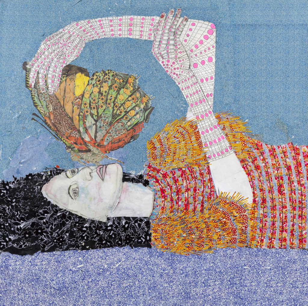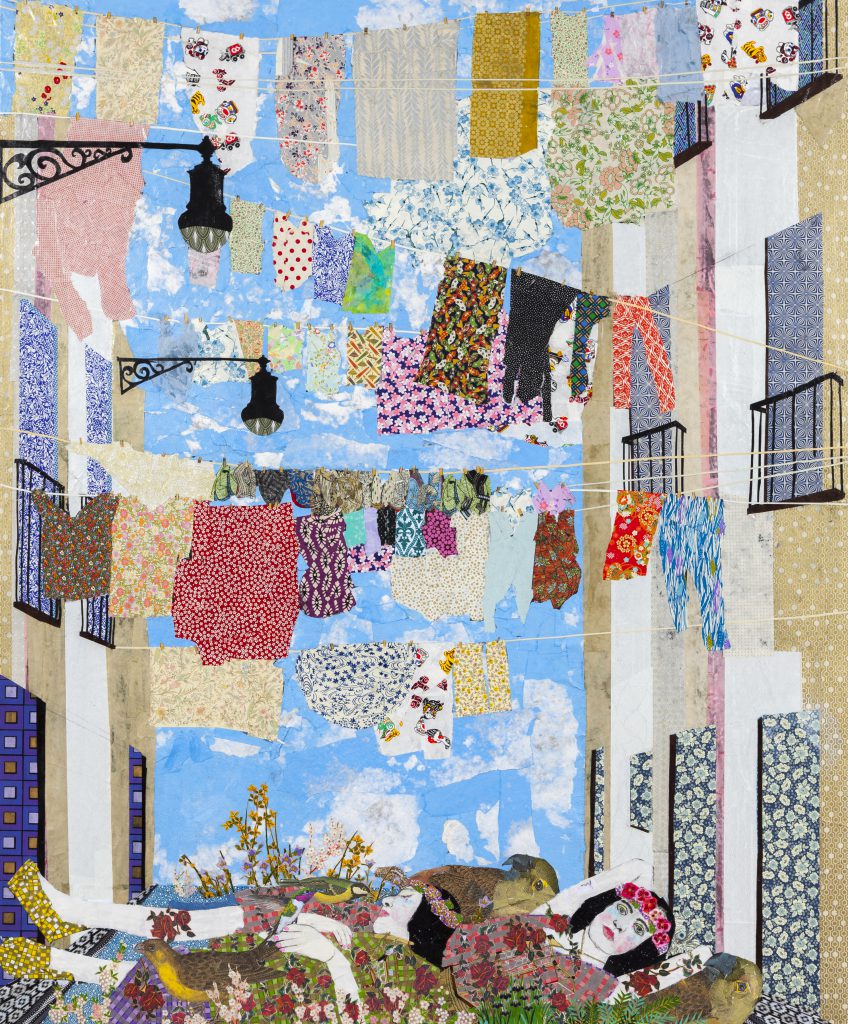 In Knitting the Wind (2015), female twins lie on a bed next to birds and below clotheslines, as musical moods or visual poems hang from one building to another. The two figures inform the ethnic and cultural duality experienced by the artist, displaced between opposite sides of the equator. The bed also references a burial ground, a mnemonic of one’s mortality. A hint to the ancient myth of Atropos, one of the Three Fates who decides the fate of one’s death, is suggested here. Yet, the stretched arms and legs of one of the twins, as a bridge between two buildings, assert that the journey continues. As the women blend with the repetitive geometric designs of their clothes, of the windows and sky, they dissipate into a kaleidoscope of distinct perceptions of depth and distance, reality and memory. The idea of knitting also evokes the traces of the journey, tying and untying, marking and erasing boundaries. Not ancient as weaving, knitting is exemplified by pulling threads through loops, resulting in fragile knitted fragments that hardly stand the test of time. Like the fleeting fragments of memory, knitting tools can be easily transportable from place to place, as the twins follow the steps of their ancestors in the transitory search for home. These patterns convey life’s rhythms (musical, mathematical, aesthetic), as they are approximated by their likenesses.