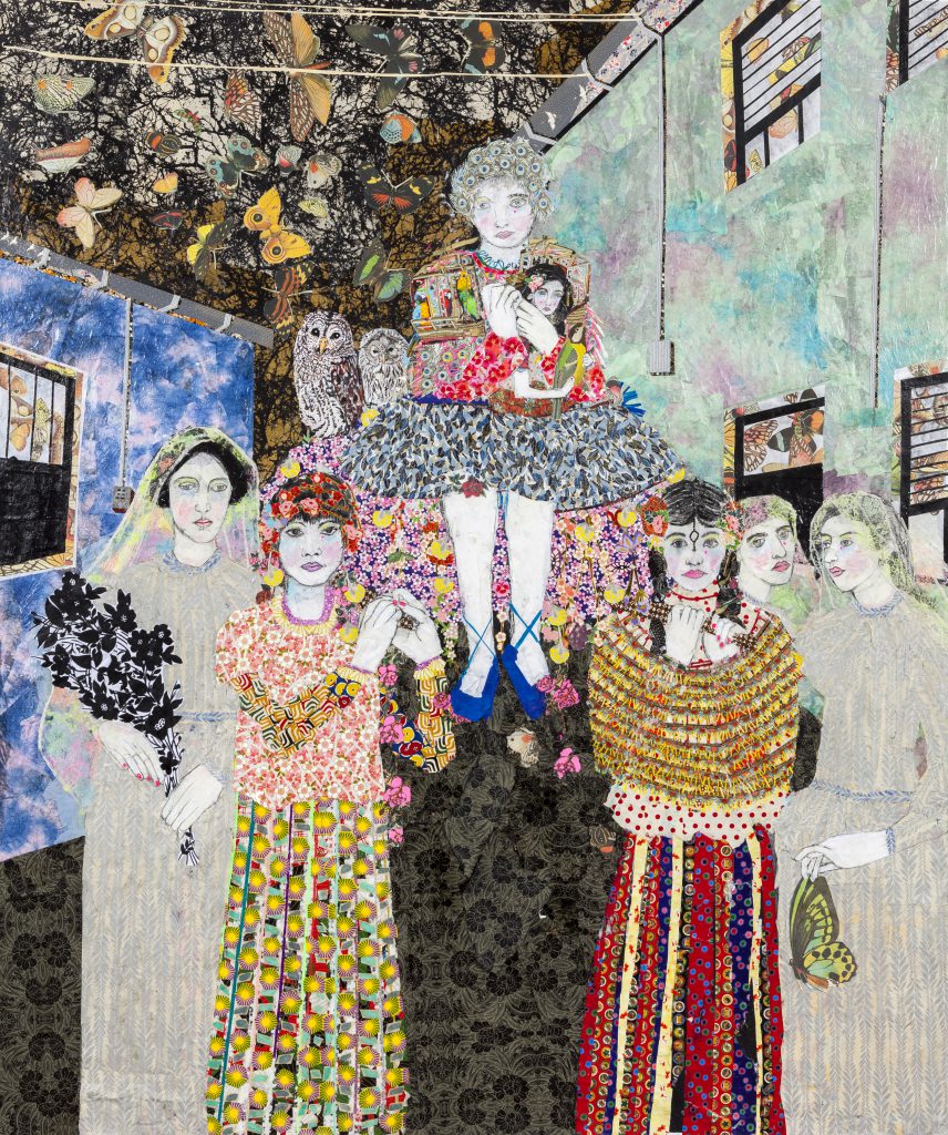 Another source of inspiration in Berrio’s work is magical realism, delineated through forces of nature or supernatural beings, often making allusions to historical or biographical situations. Her depiction of butterflies began after she read Gabriel García Márquez’s One Hundred Years of Solitude. In the novel, Meme’s love for the mechanic, Mauricio Babilonia, is manifested through hundreds of yellow butterflies fluttering around him.4 Butterflies constitute both a symbol of vigilance and desire in Berrio’s large paintings. The Procession (2015) echoes the artist’s earlier idealism as she migrated from her native Bogotá to New York, leaving behind a familiar paradise for a more precarious, unpredictable, and powerful life in the Promised Land. In the painting, two women with flowers on their heads hold a canopy as they parade across a narrow street. Butterflies emerge inside the windows of buildings, and in multitude, they fill the night sky, as their colorful wings appear threatening. Beauty suddenly becomes oppressive, overwhelming, and hopes of a better life ahead appear undetermined. Over the canopy, a young girl with her hair covered in peacock feathers sits facing the viewer with an innocent glance. Behind her, two owls symbolizing wisdom seem to observe and protect. On the girl’s lap is a miniaturized woman holding a large butterfly. The girl and the miniaturized woman create an embrace inside another embrace. Three other women with veiled faces appear in the painting; one holds a bouquet of black flowers as awareness of her mortality. The female gazes convey all their feelings into one, an amalgam of their silence, aspiration, alertness, longing, solitude, self-reliance, and awe. Distinct flowery and geometric marks create the fabric of their clothes, blending with the more dimmed ornaments of the buildings’ walls. The architectonics of difference is distilled into the great sublime.