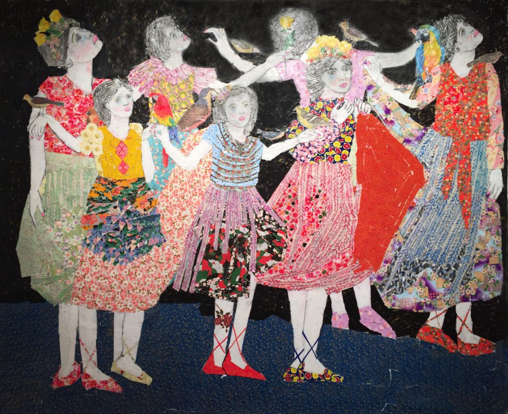 The visual world of Maria Berrio is imagined through a constellation of narratives and feelings, sometimes contradictory, other times repetitive and reflexive. Like an extended polyphony, which is lived in multi-levels and in multiple worlds, it invites us to think identity and culture a bit like the indeterminacy of the aesthetic event, as a consciousness gravitating toward other consciousnesses, inter-merging and reconstituting their own events. We can enter through her eyes as they traverse within the image, and connect to all the marks of her trail, and all the colors of her emotion. In this universe of possibilities, her main characters are young women that differ in their attire and expression, whose roles are to protect and nurture our ecosystem, a desire for the grandness of the heart. It is this myriad of suspended and intertwined shapes and meanings that identify a mythological idea of time, in which finite things and events are confined to an eternal recurrence. In it, different feelings and actions can happen all at once, as illustrated by the juxtaposed motifs. The repetitive signs or situations can be linked to mimetic histories, showing that even in the era of technological machines, our perceptions of the world appear belated, as they are driven by a blind search for a lost intimacy with our habitat. 3