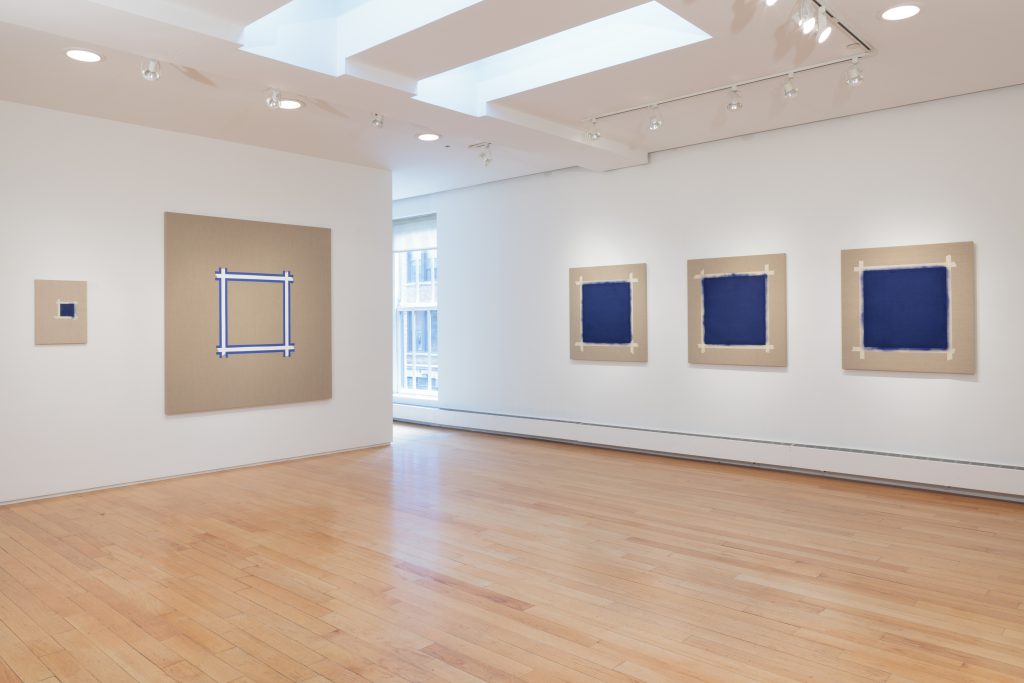 In One After Another, Sánchez alludes to the recurrence of already historicized theories and aesthetics since Suprematism; respectively, Sánchez develops his own visual language anchored on Constructivist dialects around form and surface.  For his current exhibition, Sánchez restricts his material of analysis to linen canvases and his elements of composition to the straight line – opting for horizontal and vertical positions only. Reflecting on the influence that Concrete art’s appearance and concepts had on later manifestations of abstract art, including Op-art and Hard-Edge painting, Saul Sánchez utilizes the square, repeatedly, as a reference to the historical traditions he is addressing. Each canvas contains a quadratic shape, which is repetitively spray-painted with blue. Sánchez’s takes advantage of trompe-l’oeil to speak about painting in relation to time and distance: two different approaches in terms of process. Through this technique, Sánchez constructs a deceptive perimeter with traces of tape and spray-paint; in which case, the square’s edge is built discontinuous, physically and temporally, with parts entering and exiting. The positive square is inexistent.  The idea of the square, from a purely lexical perspective, winds up being basically ambiguous; the illusory edge of the square is irregular, not the square in itself. In every painting it is imperative to recognize that even if the painted form is nebulous, in the end, the form is intuitively clear. Saul communicates the idea of the painted object – the canvas- and that of the painted subject -the surface   In Square with Ultramarine Blue Paint I, Sánchez structures a line of canvases with minimalist rhythm. A progression of nine paintings appears quasi-identical; however, through a thorough observation, the subtle nuances in each canvas become noticeable. The viewer interacts with a final object that, in itself, suggests the systematic serial processes since the conception of the oeuvre by the artist.   In One After Another, Sánchez explores the concept of repetition not as limited change within a pattern, but as an incessant permutation of possibilities given by a limited repertoire of forms. Square with Ultramarine Blue Paint I, Square with Ultramarine Blue Paint II, and Square with Ultramarine Blue Paint III, are positioned at a relational distance to one another; each canvas constructs the wholeness of one spatial composition. Like three components on a score, each painting orchestrates the viewers’ course. Based on its own aesthetical distinctions, each oeuvre reverberates a dissimilar tempo, which is set by the viewer’s phenomenological decisions along the space. In Square with Ultramarine Blue Paint II, Sanchez echoes the compositional structure through Square with Ultramarine Blue Paint I. Moreover, the process of construction in both Square with Ultramarine Blue Paint I and Square with Ultramarine Blue Paint II is analogical to Square with Ultramarine Blue Paint III: each canvas preserves the repetition of a same singular unit, again, and again, in a serial mode. Thus, in every work there is a clear emphasis on the procedure, which refers not to each singular object at sight, but to the actions and temporality involved in the formation of all objects as an entirety.   For One After Another, Saul emphasizes the reiteration in the construction of his paintings, both individually as well as a compositional whole. Sanchez’s interest in repeating a technical strategy while pursuing the same conceptual precept denotes the recycling of historical aesthetics that he is suggesting. In One After Another, Saul Sánchez questions our imaginary of what signifies to paint. Extending specific epochs, in each of Sanchez’s paintings, there is a trace of something that endured and of something that will prevail. Yoab Vera December 2015