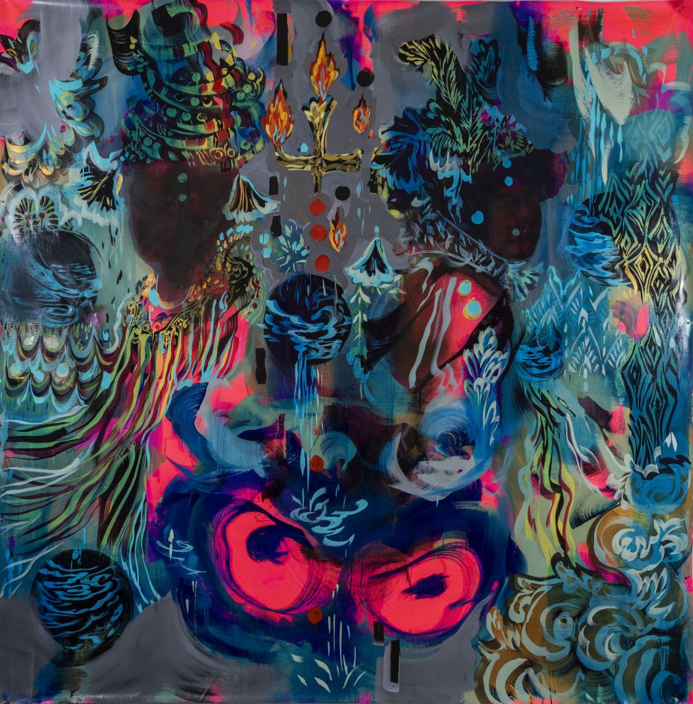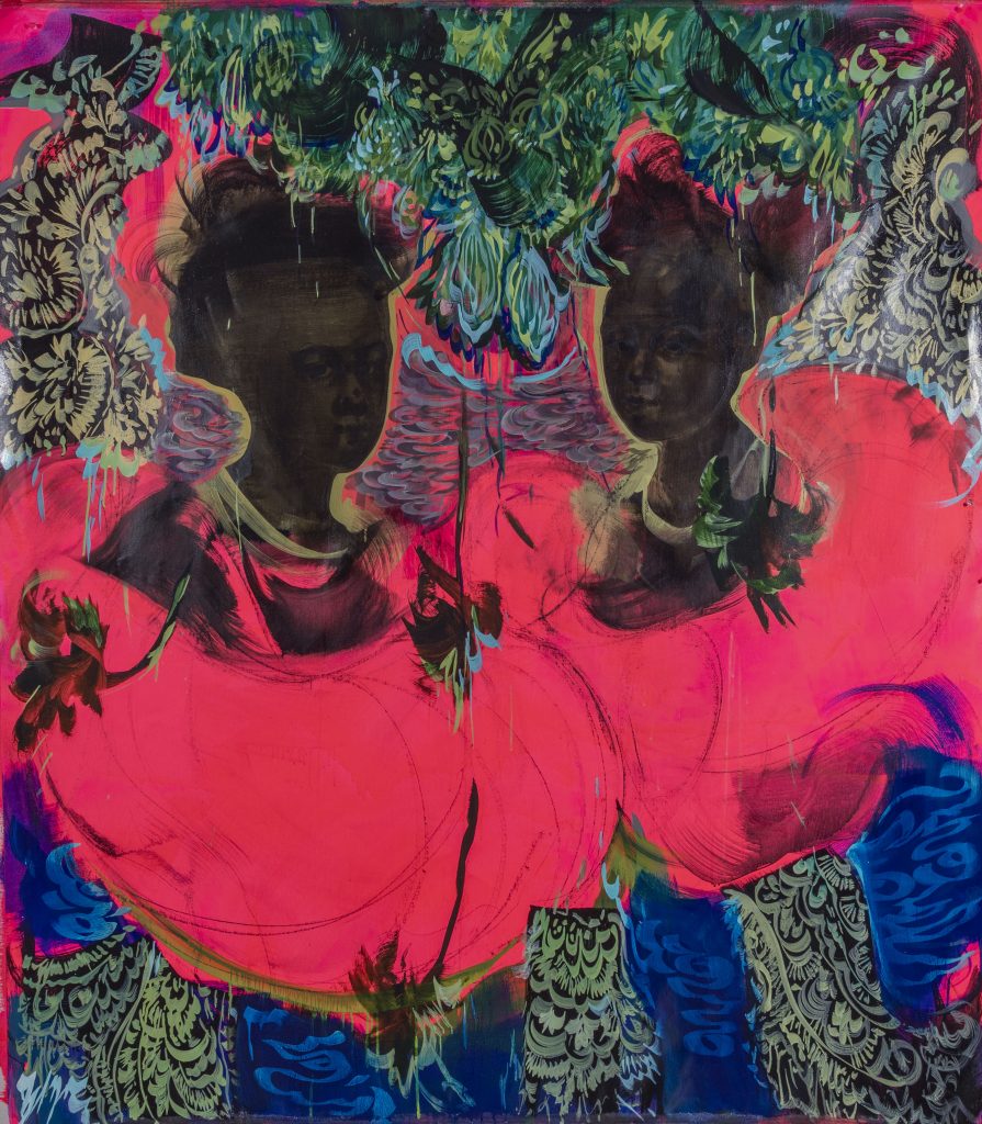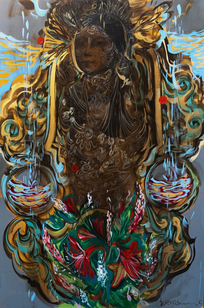 Race, the politics of color (formally and conceptually) is essential to her work. The cinnamon figure has been a constant in Garcia’s trajectory since 1996. Mixing all the colors in a palette is an inclusive action, the outcome of such activity is cinnamon color. The new race, represented by her ever-present cinnamon figure, states the creation of a new aesthetic. This unique aesthetic with new rules originated by the lush landscape, the transplantation, appropriation, and transformation of traditions. Also, the catholic iconography with her mixed- race warrior/angels is a way of colonizing the colonizers, by appropriating, transforming and creating new icons.